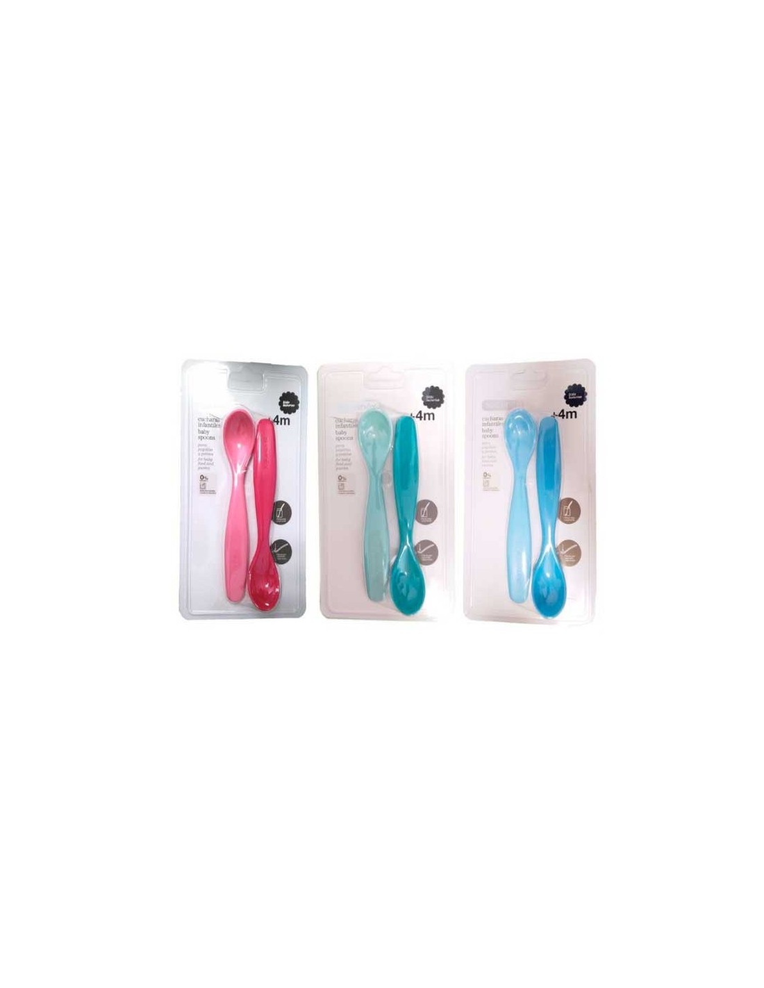 • Cucharas para bebés disponibles en azul, rosa y verde.